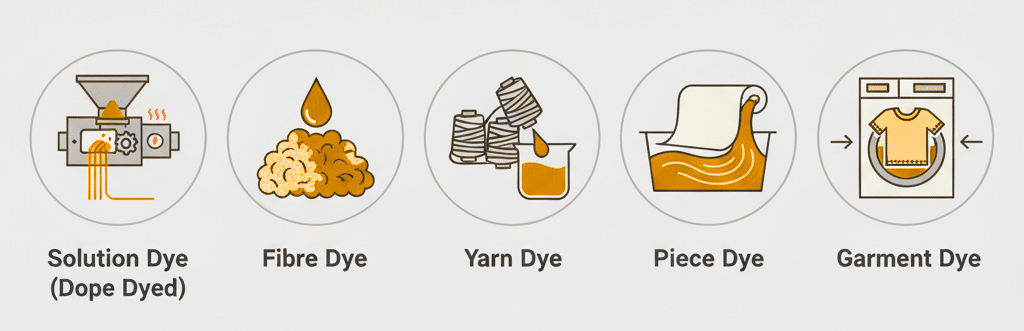 Solution Dye (Dope Dyed) โซลูชัน-ดาย (โดป-ดายด์) | ผสม pigment ลงใน polymer melt ก่อนปั่นเส้นใย | สีฝังในโครงสร้าง ทน UV, ซัก, คลอรีน และสภาพกลางแจ้งสูงสุด ใช้กับ outdoor fabric |