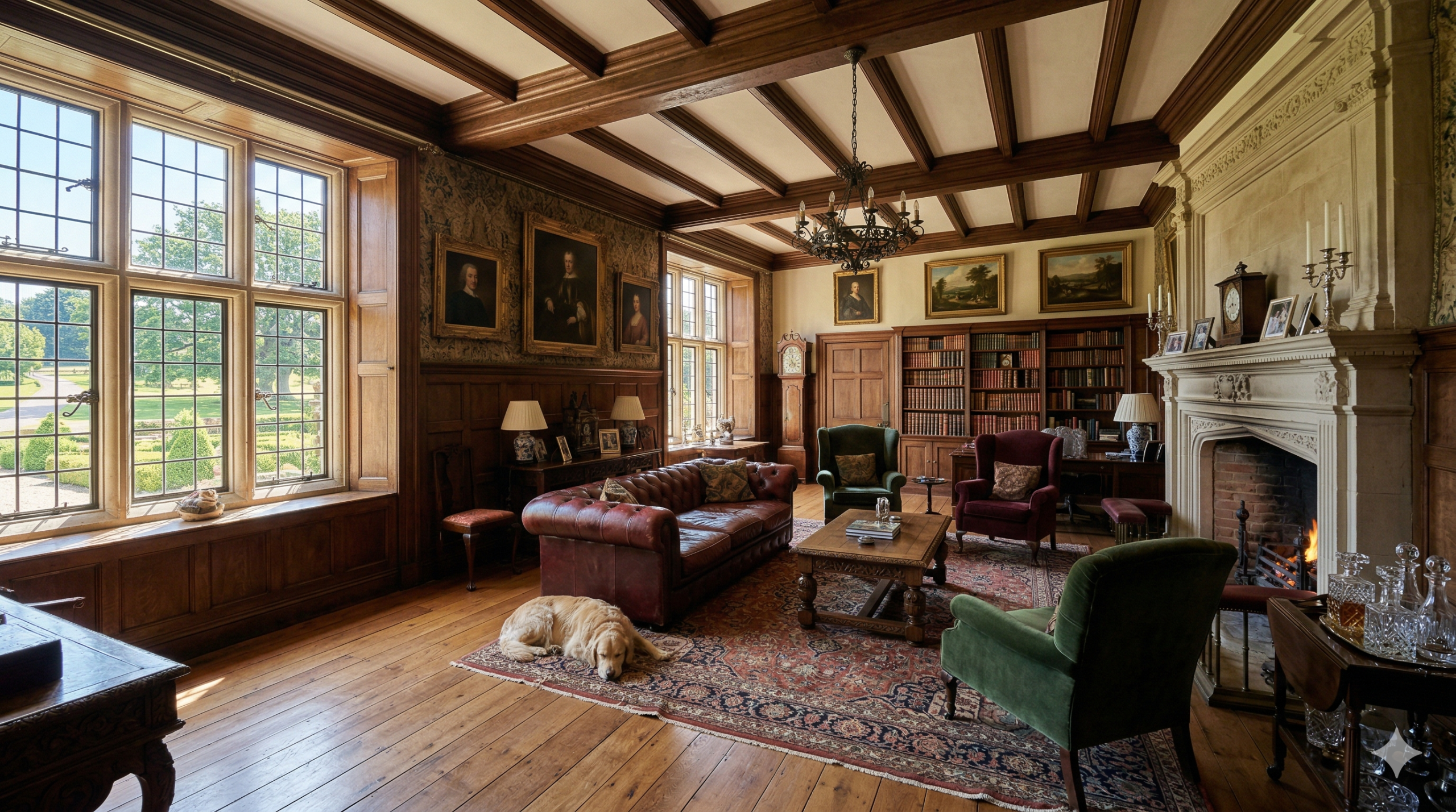 โอ่อ่า คลาสสิก อบอุ่นและมีกลิ่นอายประวัติศาสตร์ผนังกรุไม้ (Wood Paneling) เตาผิง เฟอร์นิเจอร์ชิ้นใหญ่ดั้งเดิมโทนสีเข้มรุ่มรวย (แดงเบอร์กันดี, เขียวเข้ม) ไม้โอ๊ค หนัง ผ้ากำมะหยี่ชนบทอังกฤษ