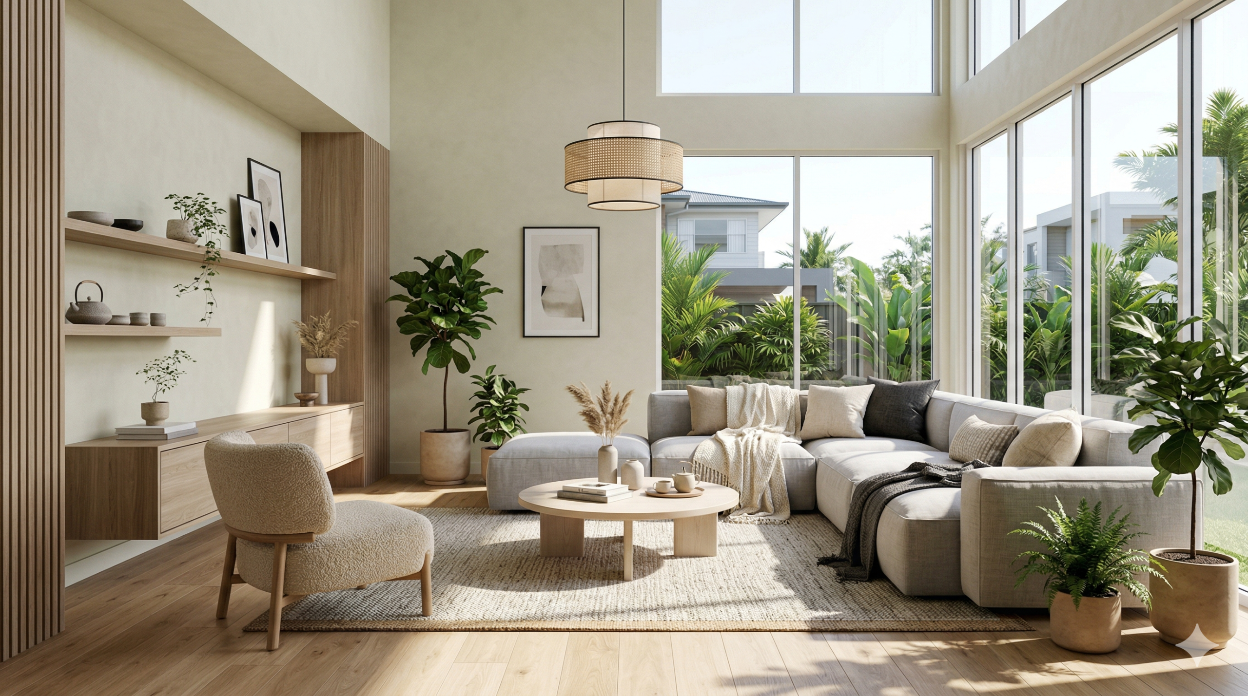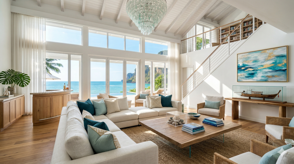 โทนสีหลัก (Color Palette)ขาวสว่าง, เทาอ่อน, ครีม และสีพาสเทลอ่อนๆคล้ายสแกนดิเนเวียน แต่จะกล้าใช้สีเข้มตัด เช่น ดำ, น้ำเงินเข้ม (Navy), เขียวป่าไม้ (Forest Green) เพื่อความลึกสีเอิร์ธโทนอุ่นๆ (เหลืองมัสตาร์ด, ส้มดินเผา), สีฟ้า/น้ำเงินทะเล และพื้นหลังสีขาวสะท้อนแสงแดด