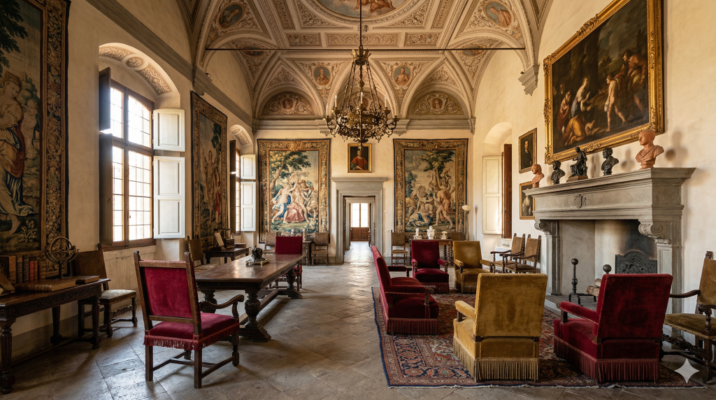 ยิ่งใหญ่ หรูหรา เน้นความสมมาตรและสัดส่วนคลาสสิกภาพวาดฝาผนัง/เพดาน (Fresco) เสาโรมัน ซุ้มโค้งสีทอง แดง น้ำเงิน หินอ่อน ปูนปั้น ไม้เนื้อแข็ง ผ้าทอ (Tapestry)อิตาลี